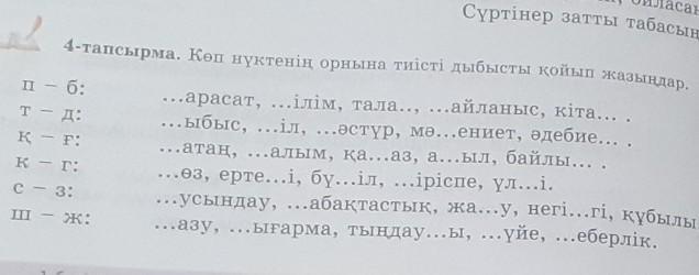 2 4-тапсырма. Көп нүктенің орнына тиісті дыбысты қойып жазыңдар. п— б: т— д: Қ— Ғ: ...арасат, ...ілім, тала.., ...айланыс, кіта... . ...ыбыс, ...іл, ...өстүр, мә...ениет, әдебие... ...атаң, ...алым, қа...аз, а...ыл, байлы... . ...Өз, ерте...і, бү...іл, ...іріспе, үл...і. к — г: с — 3: ... усындау, ...абақтастық, жа...у, негі...гі, құбылы... IIT - Ж: ...азу, ...ығарма, тыңдау...ы, ...үйе, ...еберлік. 1