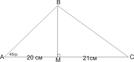 в треугольнике один из углов при основании равен 45 градусов а высота делит основание на две части : 20см и 21 см . Найдите большую боковую сторону .