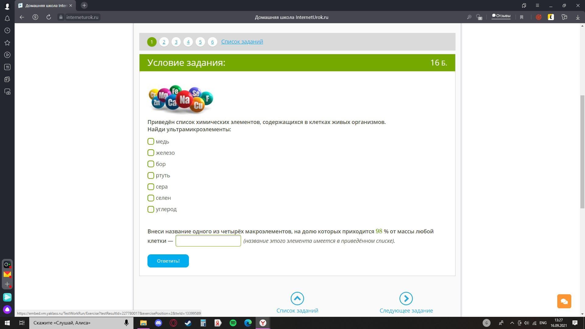 Макроелементи (вміст понад 0,01%): Карбон, Гідроген, Оксиген, Нітроген, Фосфор, Сульфур, Натрій, Кальцій, Калій, Магній, Хлор, Ферум.