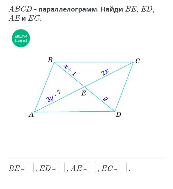 BE = 4 +1 =5 ; ED = 5 ; AE = 3*5 - 7 = 8 ; EC = 2*4 = 8