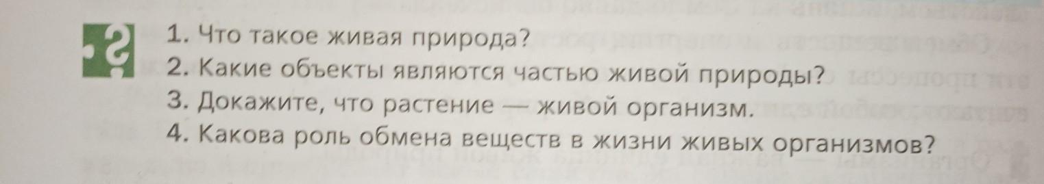 1.Живая природа - это те предметы, которые могут дышать, расти и умирать, точно также как человек. 2. Дерево, трава, цветы, животные и т.д. 3.Растения растут,питаются,размножаются,как любой живой организм. 4. без обмена веществ органы (вернее клетки) не будут иметь "силы", то есть всем организмам (и клеткам в том числе) нужны питательные вещества и кислород в том числе ведь он тоже принимает участие в обмене веществ.