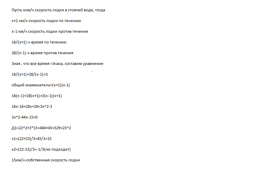 Моторная лодка прошла 24 км против течения реки и 16 км по течению, затратив на весь путь 3 ч. Какова скорость лодки в стоячей поде, если скорость течения реки 1 км/ч?