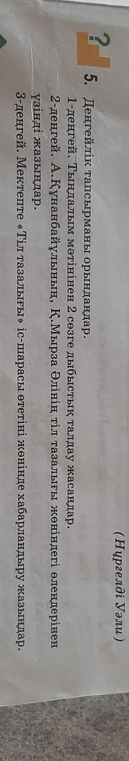 5. Деңгейлік тапсырманы орындаңдар. 1-деңгей. Тыңдалым мәтінінен 2 сөзге дыбыстық талдау жасаңдар. 2-деңгей. А.Құнанбайұлының, Қ.Мырза Әлінің тіл тазалығы жөніндегі өлеңдерінен үзінді жазыңдар. 3-деңгей. Мектепте «Тіл тазалығы» іс-шарасы өтетіні жөнінде хабарландыру жазыңдар.