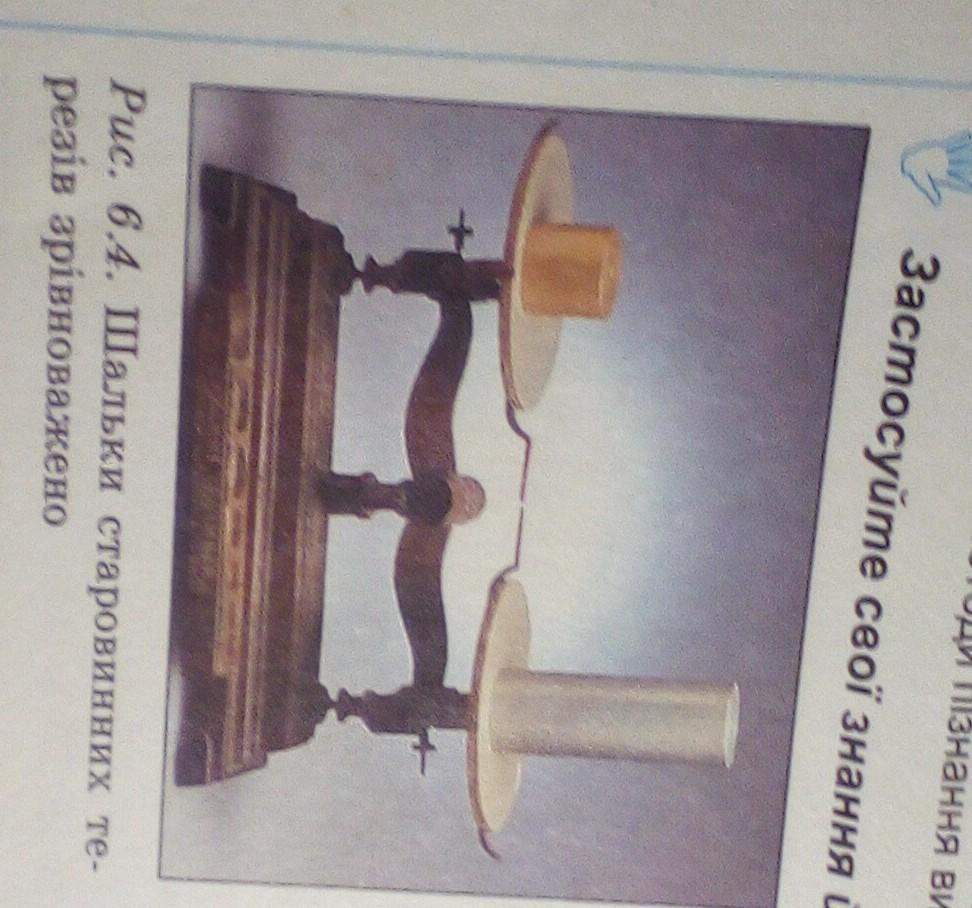 6. На рисунку 6.4 зображено два циліндри, виточені з міді та алюмінію. Чому терези зрівно- важені, хоча об'єм мідного циліндра чи не вдвічі менший за об'єм алюмінієвого? 7. Чому алюміній використовують у літако- будуванні? 8 Для чого в повсякденному житті викорис-
