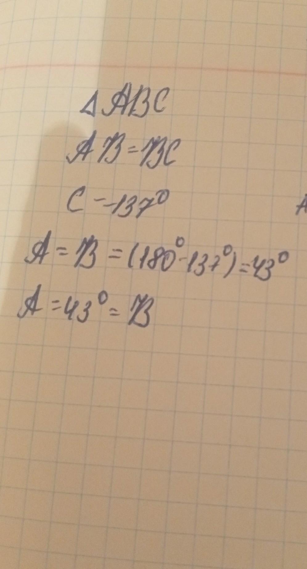 Угол А = углу С так как АВ =ВС => угол А = 43 градуса