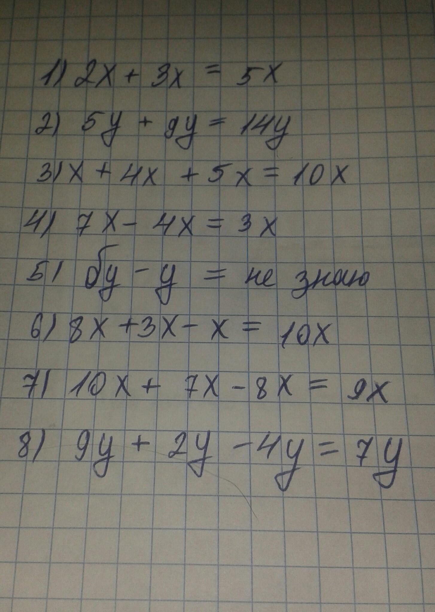 95. Упростите выражение: 1) 2x + 3x; 3) 5у + 9у; 5) x+4х + 5x; 2) 7x - 4x; 4) бу - у; 6) 8х + 3х - х; 7) 10x + 7x - 8x; 8) 9y + 2y - 4у. срочно надо пожалуйста
