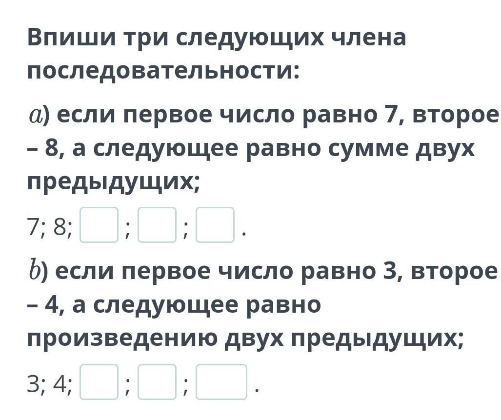 Впиши три следующих члена последовательности: a) если первое число равно 7, второе – 8, а следующее равно сумме двух предыдущих; 7; 8;;;. b) если первое число равно 3, второе – 4, а следующее равно произведению двух предыдущих; 3; 4;;;.