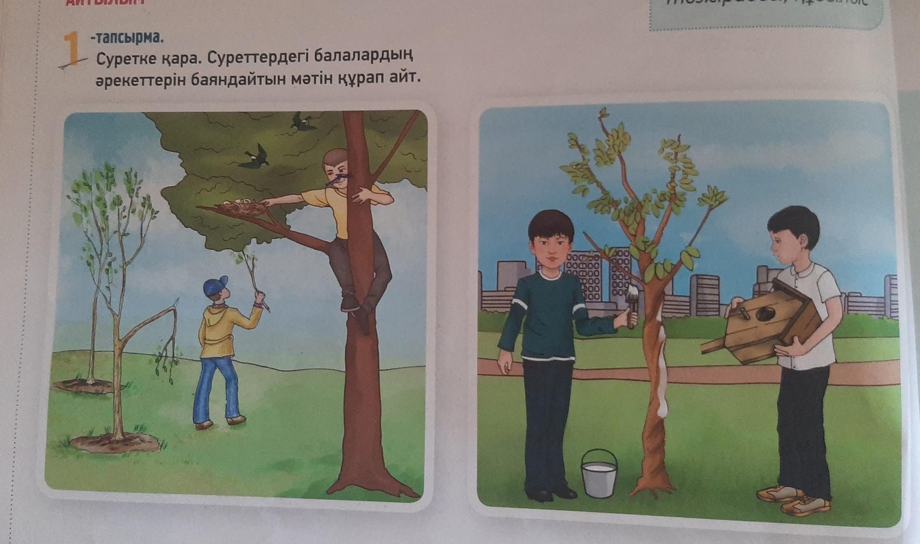 Суретке қара.Сурттердегі балалардың әрекеттерін баяндайтын мәтін құрап айт 7 класс 1 тапсырма