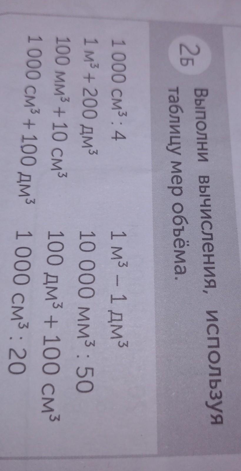 2Б Выполни вычисления, используя таблицу мер объёма. 1 000 см3 : 4 1 м3 - 1 дм3 1 м3 + 200 дм3 10 000 мм3 : 50 100 мм3 + 10 см3 100 дм3 + 100 см3 1 000 см3 + 100 дм3 1 000 см3 : 20 помогите пж и напишите верный ответ