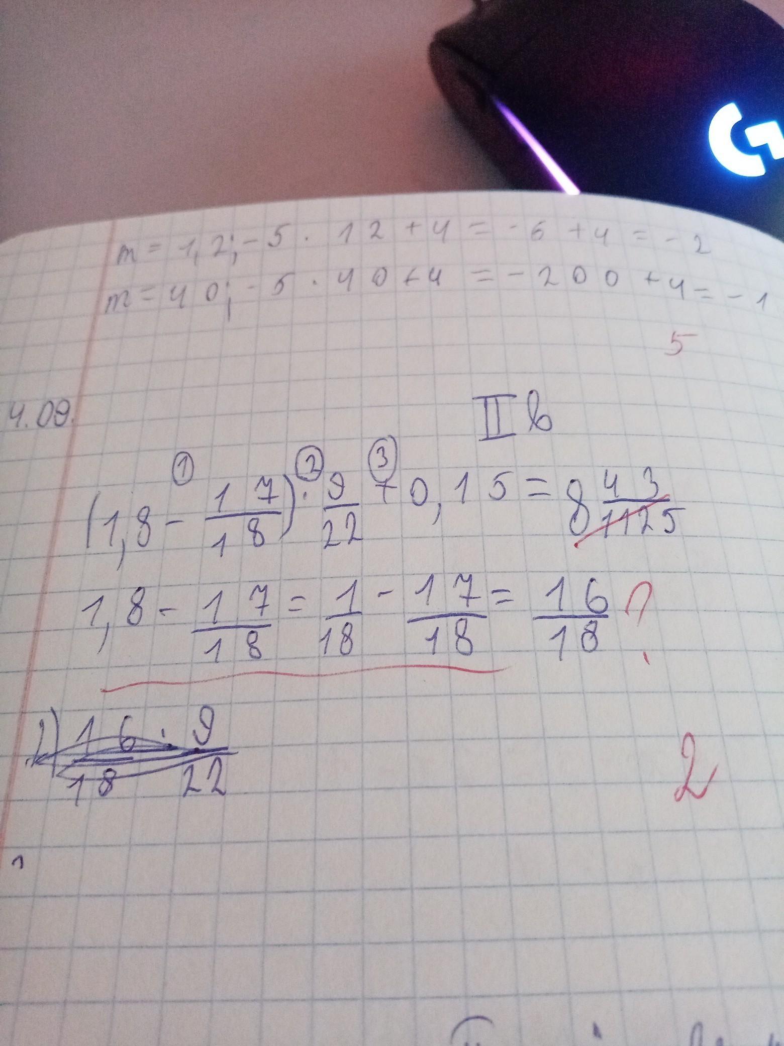 Ответ: Для начала переводим десятичное число в дробь 18/10, после сокращаем всю дробь на 2, получаем 9/5. Дальше приводим знаменатели к единому множеству 90. Получаем 9•18-17•5/90= 162-85/90= 77/90