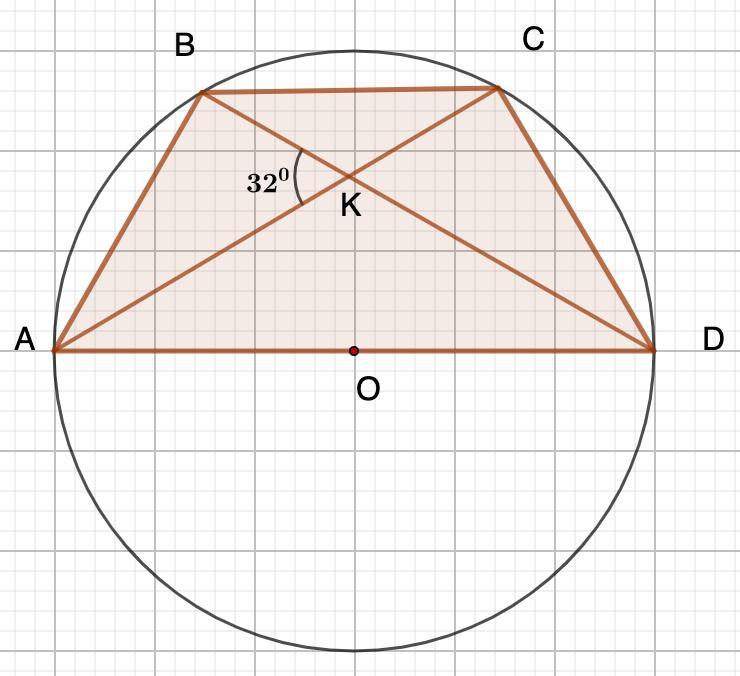 Рівнобічна трапеція вписана в коло, центр якого лежить на більшій основі. Кут між діагоналями трапеції, протилежний її бічній стороні, дорівнює 32°. Знайдіть кути трапеції