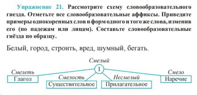 Упражнение 21. Рассмотрите схему словообразовательного гнезда. Отметьте все словообразовательные аффиксы. Приведите примеры однокоренных слов и форм одного и того же слова, изменив его (по падежам или лицам). Составьте словообразовательные гнёзда по образцу. Белый, город, строить, вред, шумный, бегать.