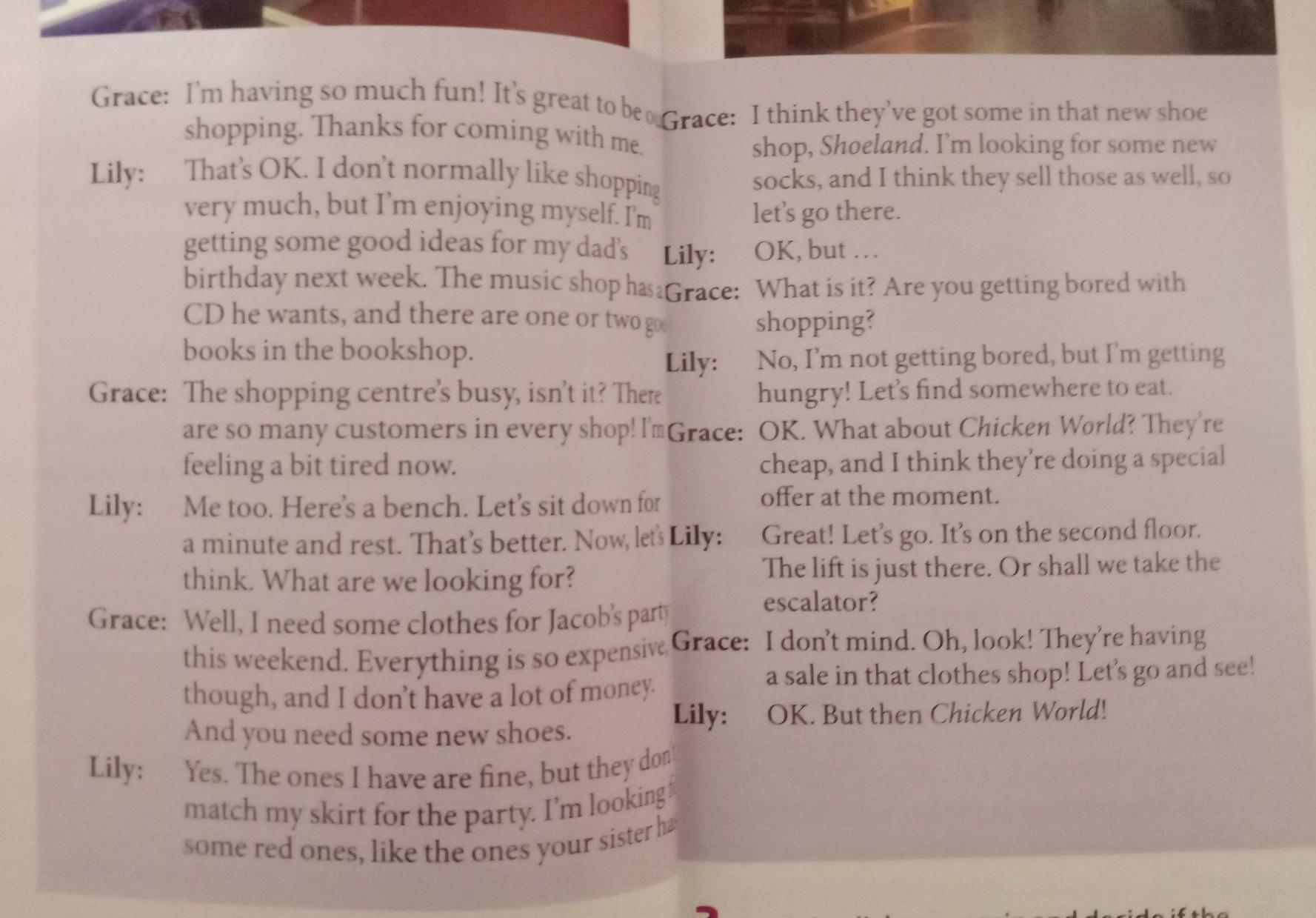 1 Read the dialogue and write‘G’for Grace orʻL'for Lily. 1 Who doesn't usually enjoy shopping? 2 Who is looking for new clothes? 3 Who is looking for things for someone else? 4 Who wants to look at clothes before eating?