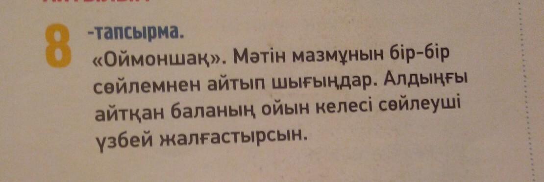 АЙТЫЛЫМ 8 -тапсырма. «Оймоншақ». Мәтін мазмұнын бір-бір сөйлемнен айтып шығыңдар. Алдыңғы айтқан баланың ойын келесі сөйлеуші үзбей. казахский язык