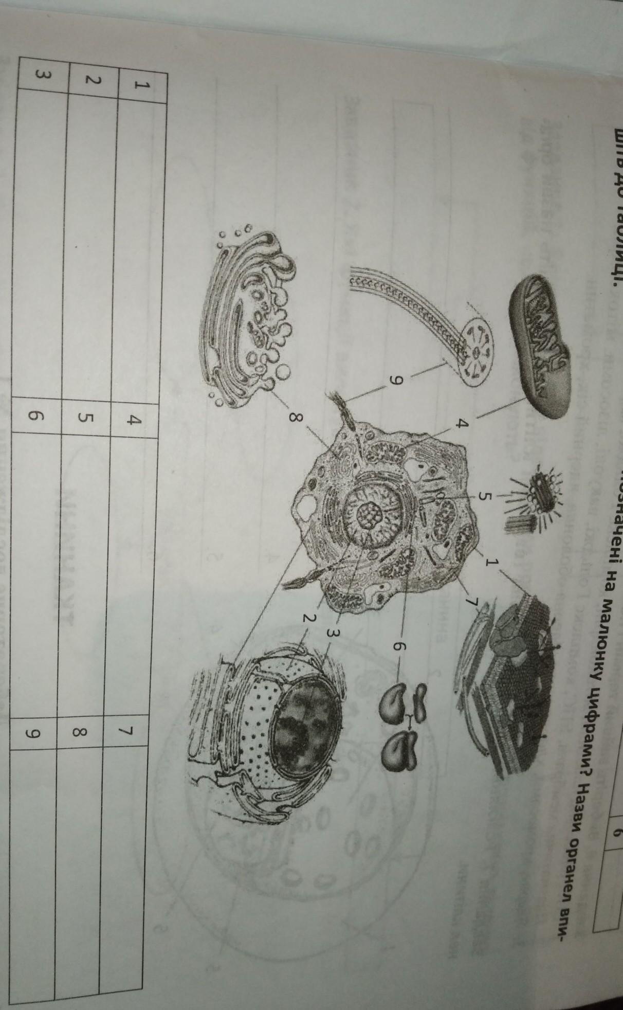 Якi складовi клiтини позначенi на малюнку цифрами? Назви органел впишiть до таблицi