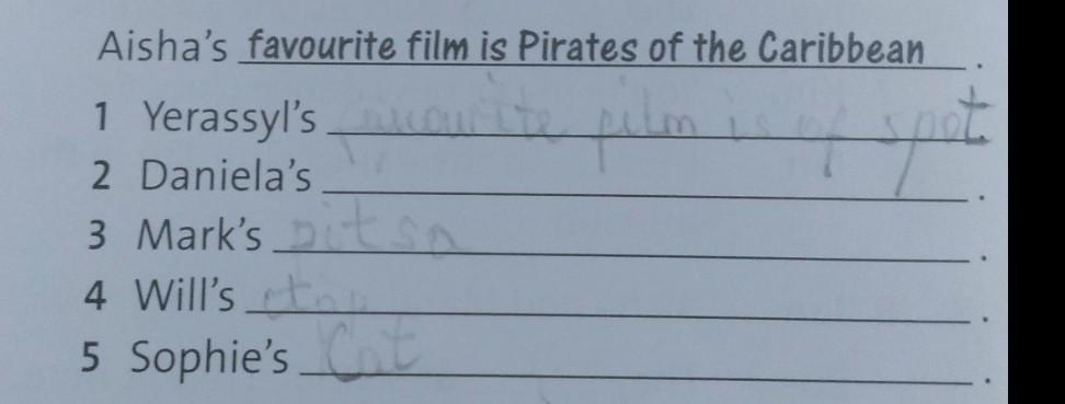 4 *** Look at the puzzle and write sentences about the children's favourite things. Aisha re Yerassy! Daniela Mark Sophie Chelsea Chelsea Will Aisha's favourite film is Pirates of the Caribbean 1 Yerassyl's 2 Daniela's 3 Mark's 4 Will's 5 Sophie's дам 65 балов