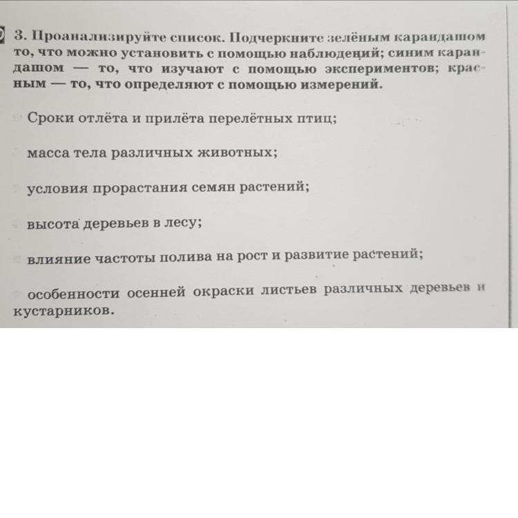 3.Проанализируйте список.Подчеркните зеленых карандашом то, что можно установить с помощью наблюдений;синим карардашом-то, что изучают с помощью экспериментов; красным карандашом то, что определяют с помощью изменений.