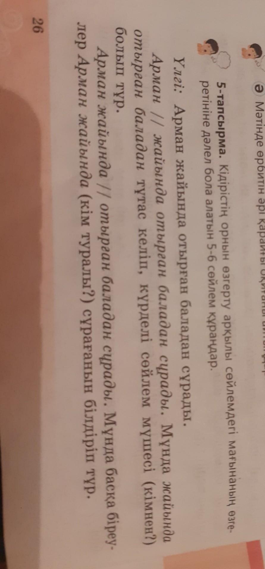 5-тапсырма. Кідірістің орнын өзгерту арқылы сөйлемдегі мағынаның өзге ретiнiне далел бола алатын 5-6 сөйлем құраңдар.