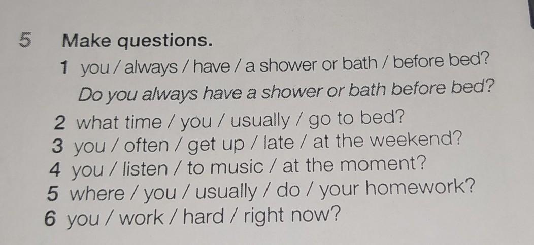 2 what time / you / usually / go to bed? 3 you / often / get up / late / at the weekend? 4 you / listen / to music / at the moment? 5 where / you / usually / do / your homework? 6 you / work / hard / right now?