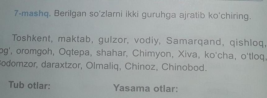 Tub otlar: Toshkent, maktab, vodiy, qishloq, bog`, shahar, Chimyon, Xiva, ko`cha, Chinoz, Chinobod