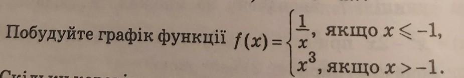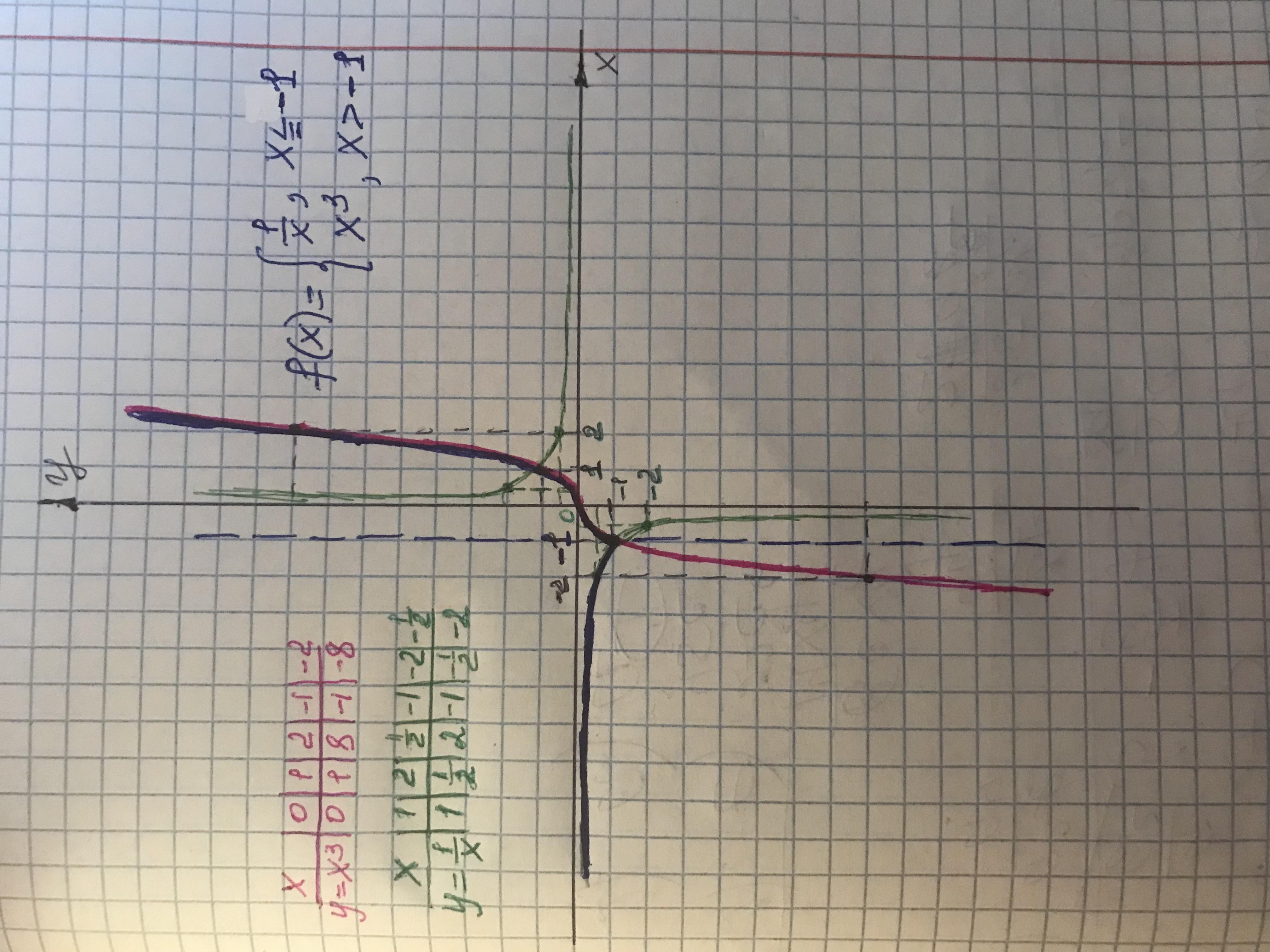 Затем обратим внимание на условие. Левее точки х=-1 (х≤ -1) - гипербола. Правее точки х=-1 (х>-1) - кубическая парабола. Обведем эти части графиков и получим искомый график.