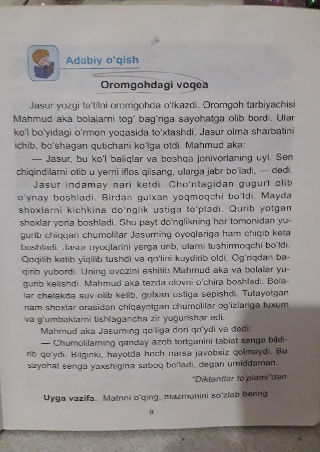 о чем рассказ Oromgohdagi voqea????? Кратко , на узб с переводом. пожалуйста. не могу загрузить фото рассказа