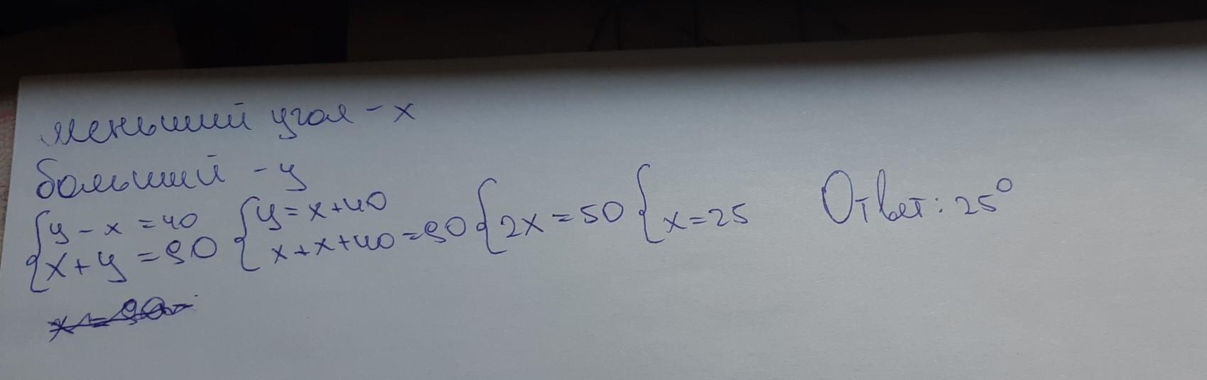 чему равна градусная мера меньшего острого угла прямоугольного треугольника, если разность его острых углов равна 40°
