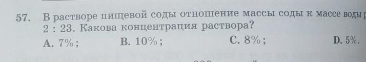57. В растворе пищевой соды отношение массы соды к массе воды раза 2:23. Какова концентрация раствора? А. 7: В. 100%: С. 8%; D. 5.