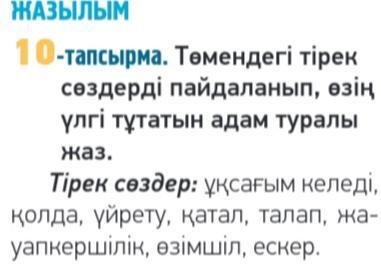 Мен өзімнің әкеме ұқсағым келеді. Ол өте қарапайым, өзімшіл емес, қажет кезінде қатал да бола алады. Әрбір істі жауапкершілікпен орындайды. Өзгеден де соны талап етеді. Өз білгенін үйретуден жалықпайды. Әрдайым жақсы істі қолдап, дұрыс емес әрекеттерді ескертеді.