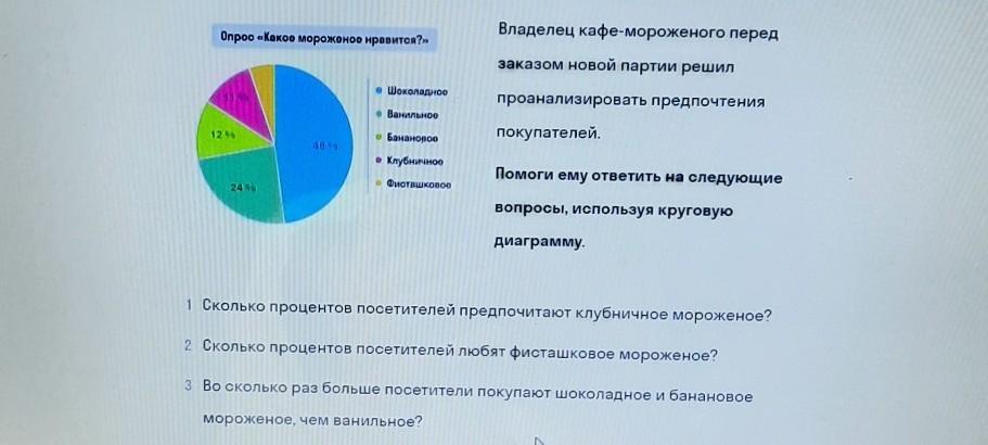 Владелец кафе-мороженого перед Опрос «Какое мороженое нравится?» заказом новой партии решил в шоколадное проанализировать предпочтения I BAIHUьнihoo Бандолоо покупателей. Клубничною Помоги ему ответить на следующие Іш истагаторно вопросы, используя круговую диаграмму. 1 Сколько процентов посетителей предпочитают клубничное мороженое? 2 Сколько процентов посетителей любят фисташковое мороженое? 3 Во сколько раз больше посетители покупают шоколадное и банановое мороженое, чем ванильное?