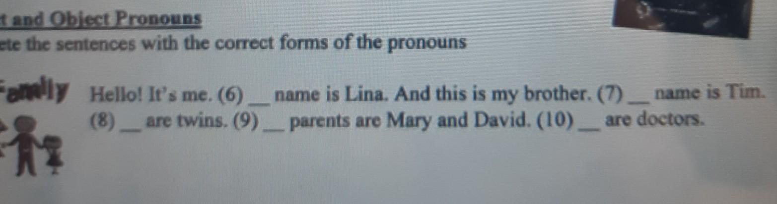 y Hello! It's me. (6) (8)_ are twins. (9) name is Lina. And this is my brother. (7)_name is Tim. parents are Mary and David. (10) __are doctors. _