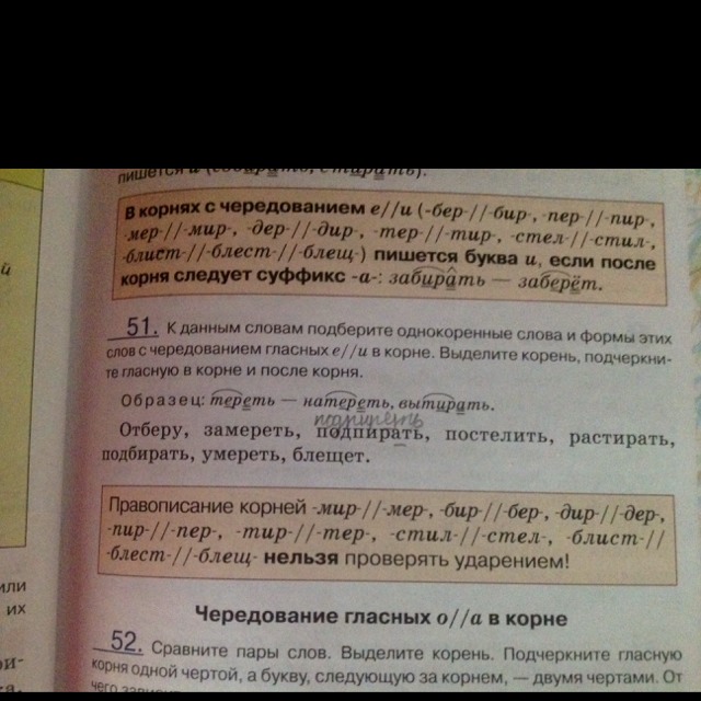 К данным словам под берите однокоренные слова и формы этих слов с чередованием гласных е//и в корне . Отберу , замереть , подпирать , по стелить , растирать , подбирать, умереть, блещет