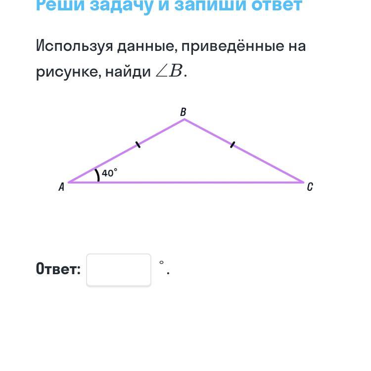 Так как сумма всех углов в треугольнике равна 180, то угол В= 180-40-40=100