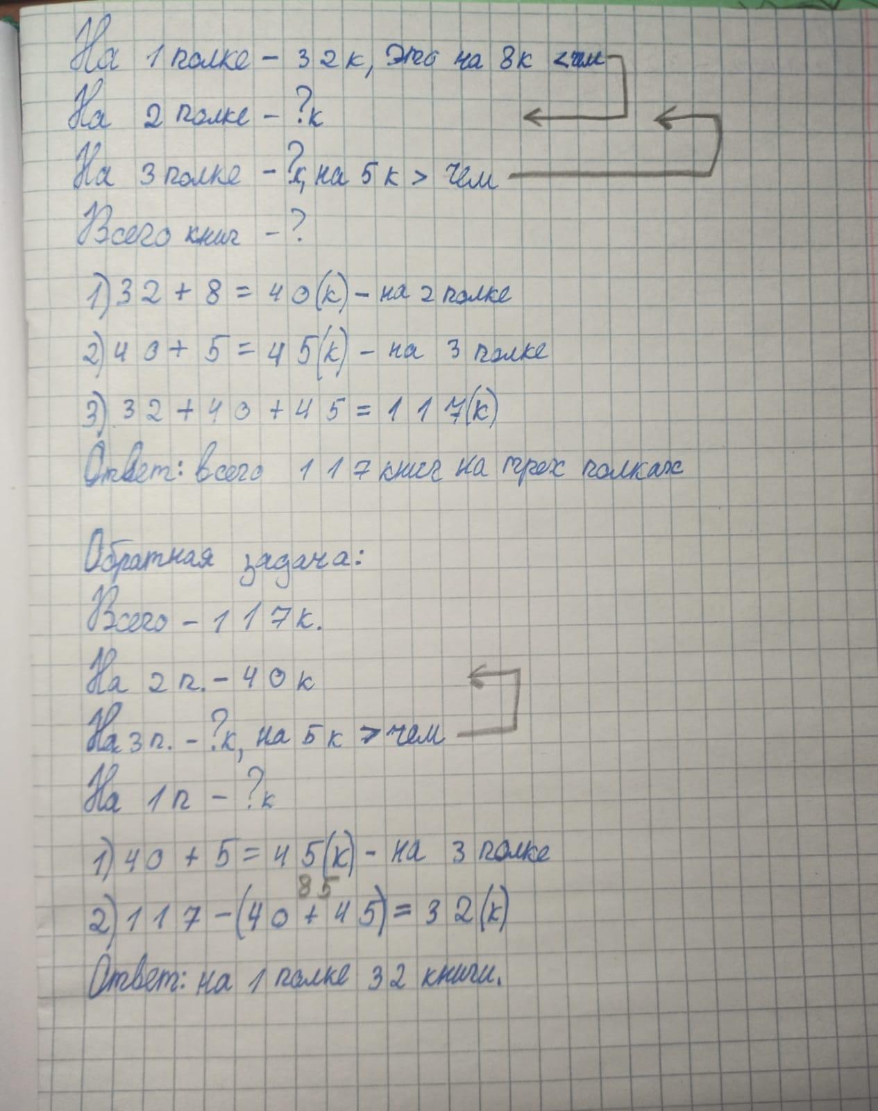 106. На первой полке 32 книги, это на 8 книг меньше, чем на второй, на третьей — на 5 книг больше, чем на второй. Сколько всего книг на трех полках?