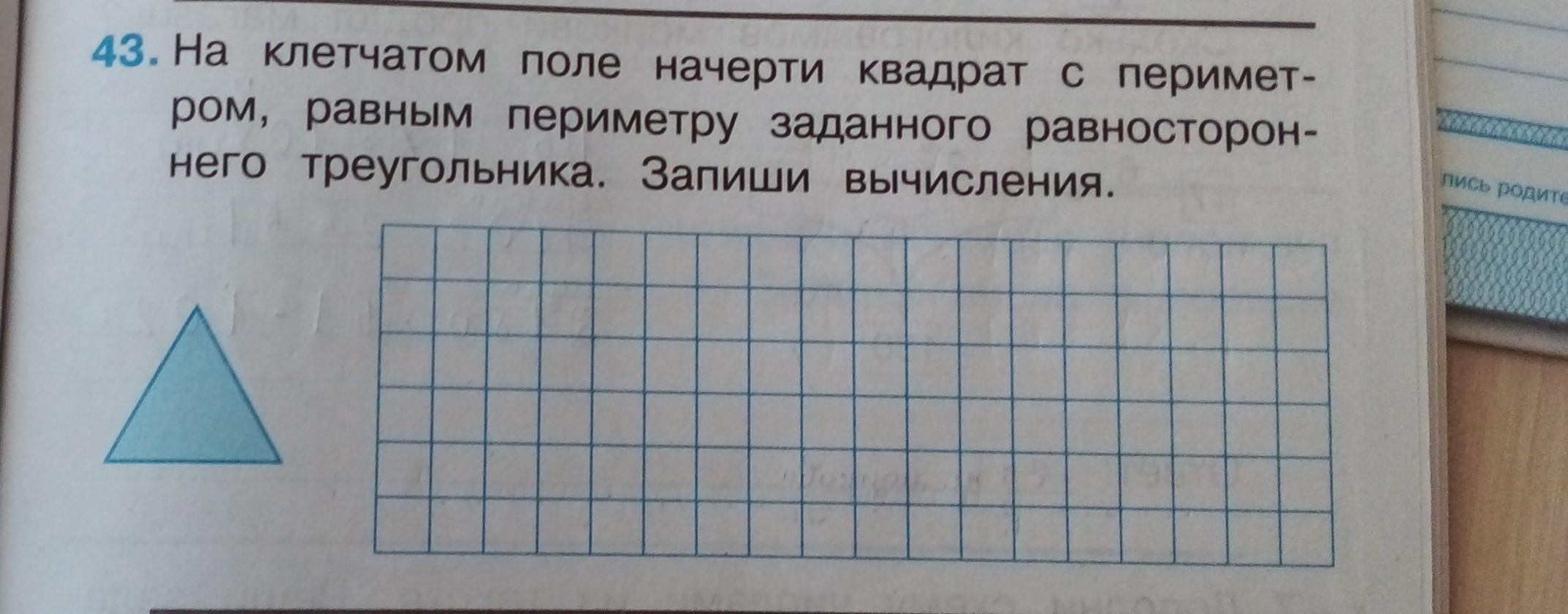 На клетчатом поле начерти квадрат с периметром, равным периметру заданного равностороннего треугольника. Запиши вычисления.