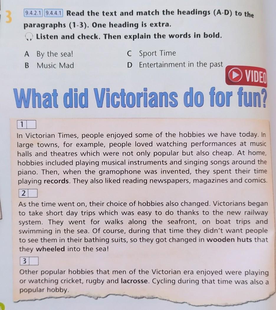 В 1м абзаце говорится, что люди во викторианские времена занимались тем же, чем и мы сейчас. В основном всё связано с музыкой (слушали ее, ходили на выступления,играли на муз.инструментах и тд)