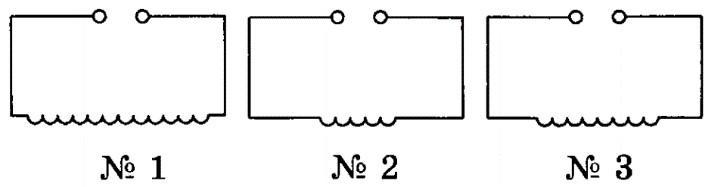 На схемах умовними знаками зображені котушки, що відрізняються одна від одної тільки числом витків. Яка з них здійснює найменшу магнітну дію при рівних силах струму в них?