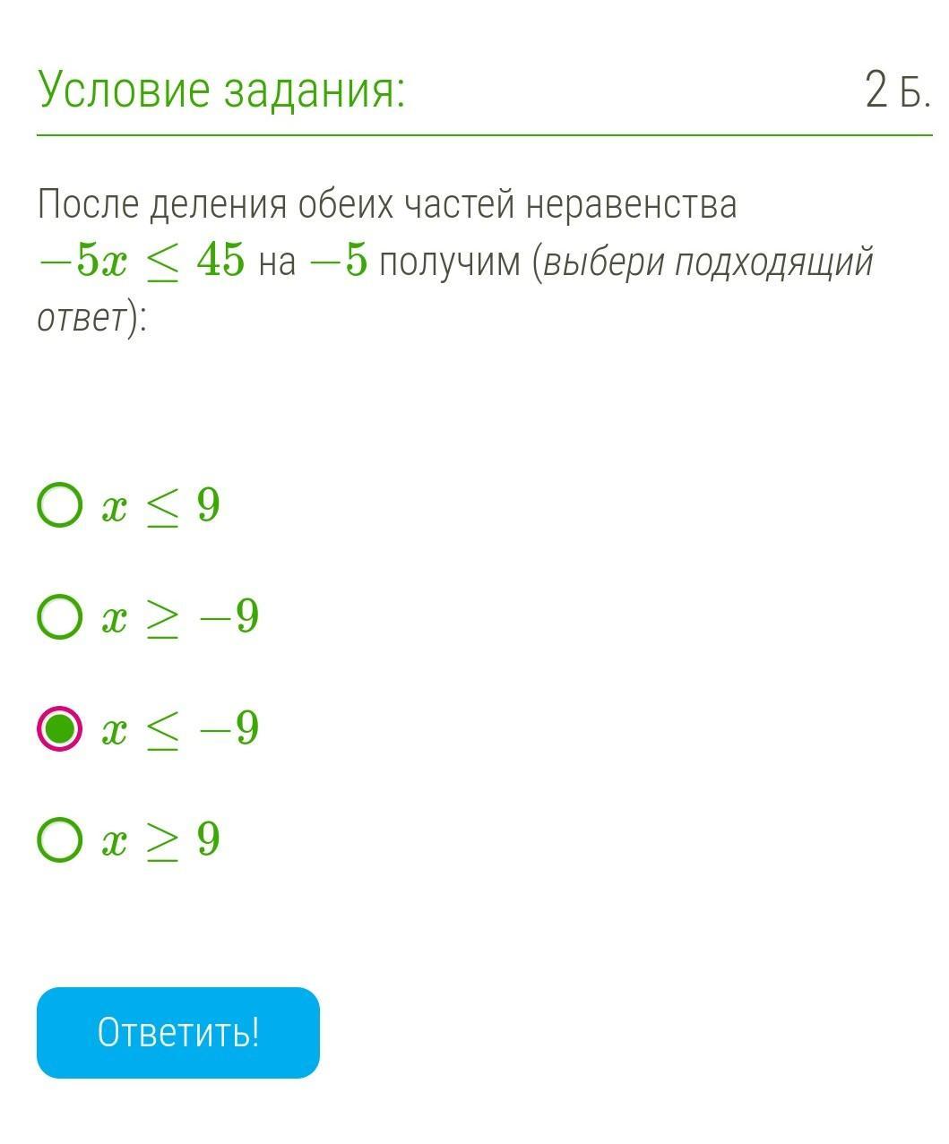 После деления обеих частей неравенства −5x≤45 на −5 получим (выбери подходящий ответ)