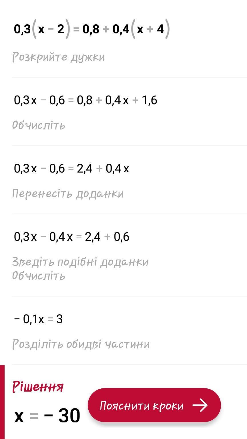 б) 0.3(x-2) = 0.8+0.4(x+4)