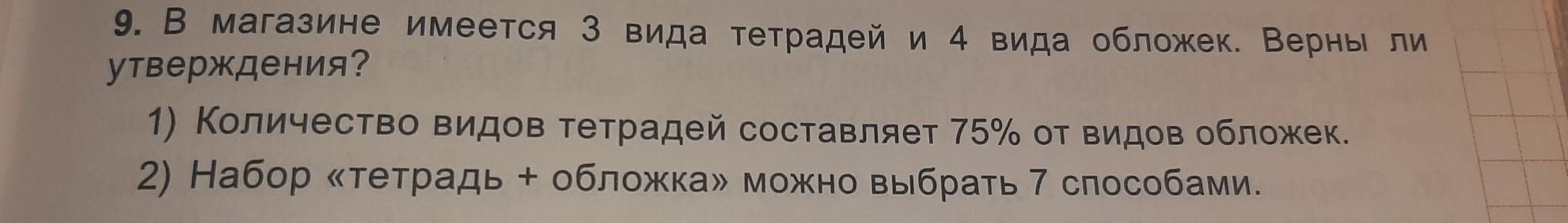 2) Количество способов выбрать одну тетрадь из трёх видов тетрадей равен 3, количество способов выбрать одну обложку из четырёх видов обложек равен 4. Составляя набор "тетрадь+обложка", количество способов выбора мы перемножаем. Получаем 12 способов составления набора. (А не 7).