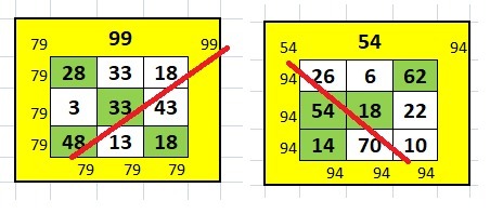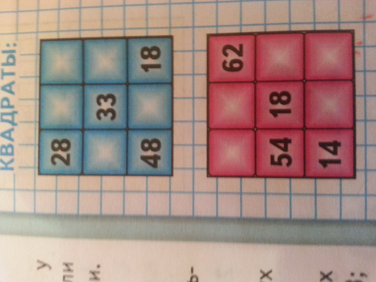 В первом варианте находим магическую сумму по данным числам 28+33+18 = 79 и находим остальные. Одна из диагоналей в каждом не вычисляется - нарушено правило образования квадрата - в центральной клетке должно стоять число равное одной трети "магической" суммы.
