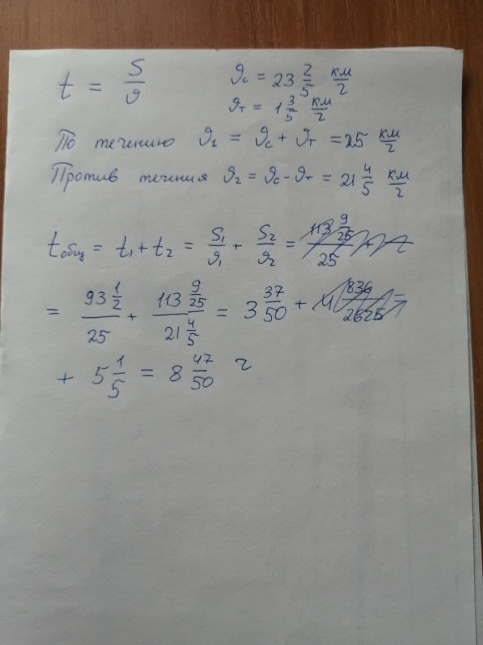 решить Моторная лодка прошла 93 1/2 км по течению реки и 113 9/25 км против течения. Сколько времени лодка была в пути, если её собственная скорость равна 23 2/5 км/ч, а скорость течения − 1 3/5 км/ч?