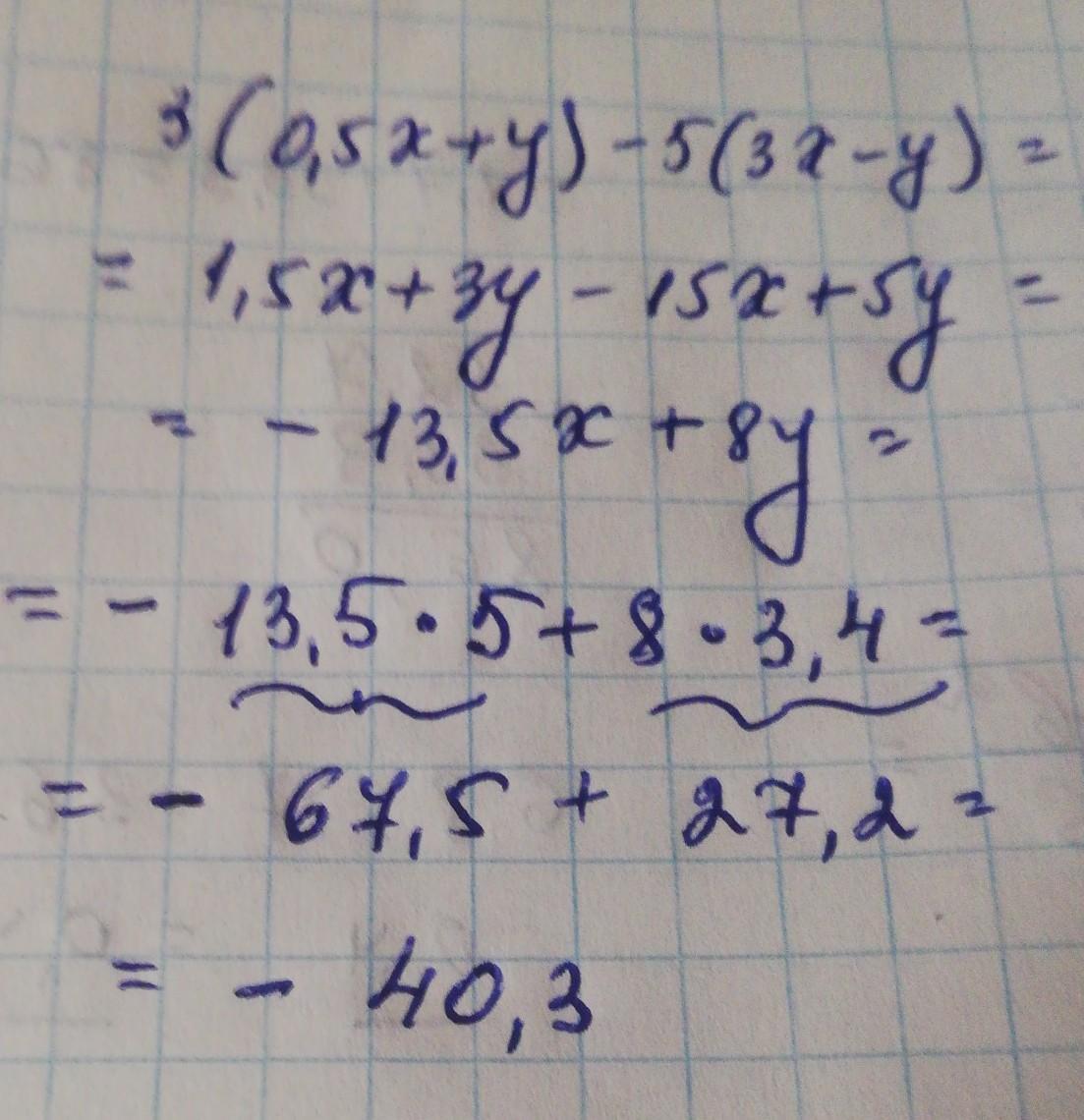 Упрости выражение 3(0,5x+y)−5(3x−y) и найди его значение, если x=5 и y=3,4. Ответ: получилось выражение