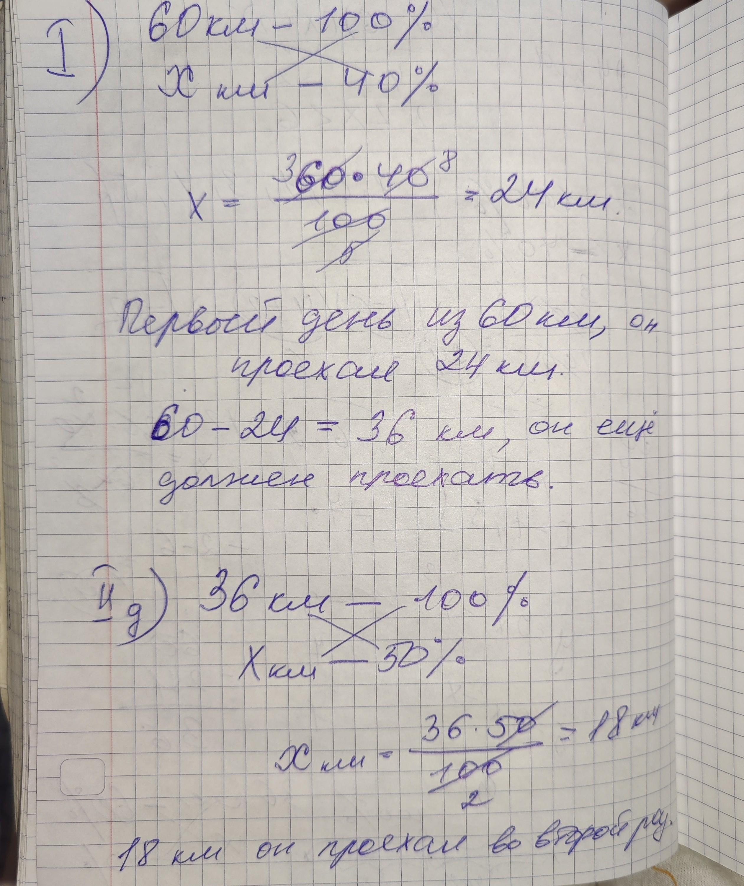 2 день: пройдено 50% от оставшегося пути, что = 0,5*(60-24)=0,5*36=18 км