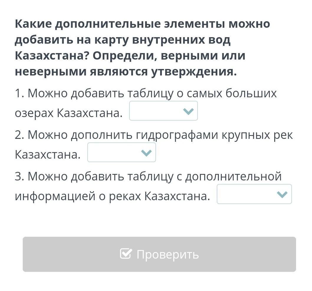 ПОМОГИТЕ ПЖ Какие дополнительные элементы можно добавить на карту внутренних вод Казахстана? Определи, верными или неверными являются утверждения.
