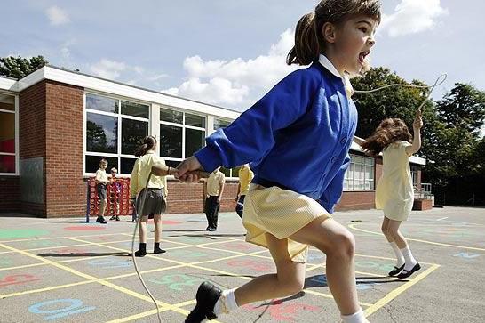 how many people are in the picture? Where are they located? What is the girl in the foreground wearing? What is painted on the pavement? What does the girl hold in her arms? What time of year is in the picture? What is the sky? What is the building made of? What color is the girl's sweater? What is the girl doing?