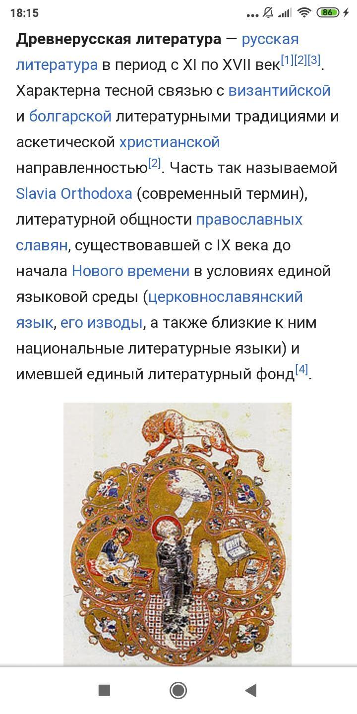 Древнерусская литература — русская литература в период с XI по XVII век. Характерна тесной связью с византийской и болгарской литературными традициями и аскетической христианской направленностью. Часть так называемой Slavia Orthodoxa (современный термин), литературной общности православных славян, существовавшей с IX века до начала Нового времени в условиях единой языковой среды (церковнославянский язык, его изводы, а также близкие к ним национальные литературные языки) и имевшей единый литературный фонд