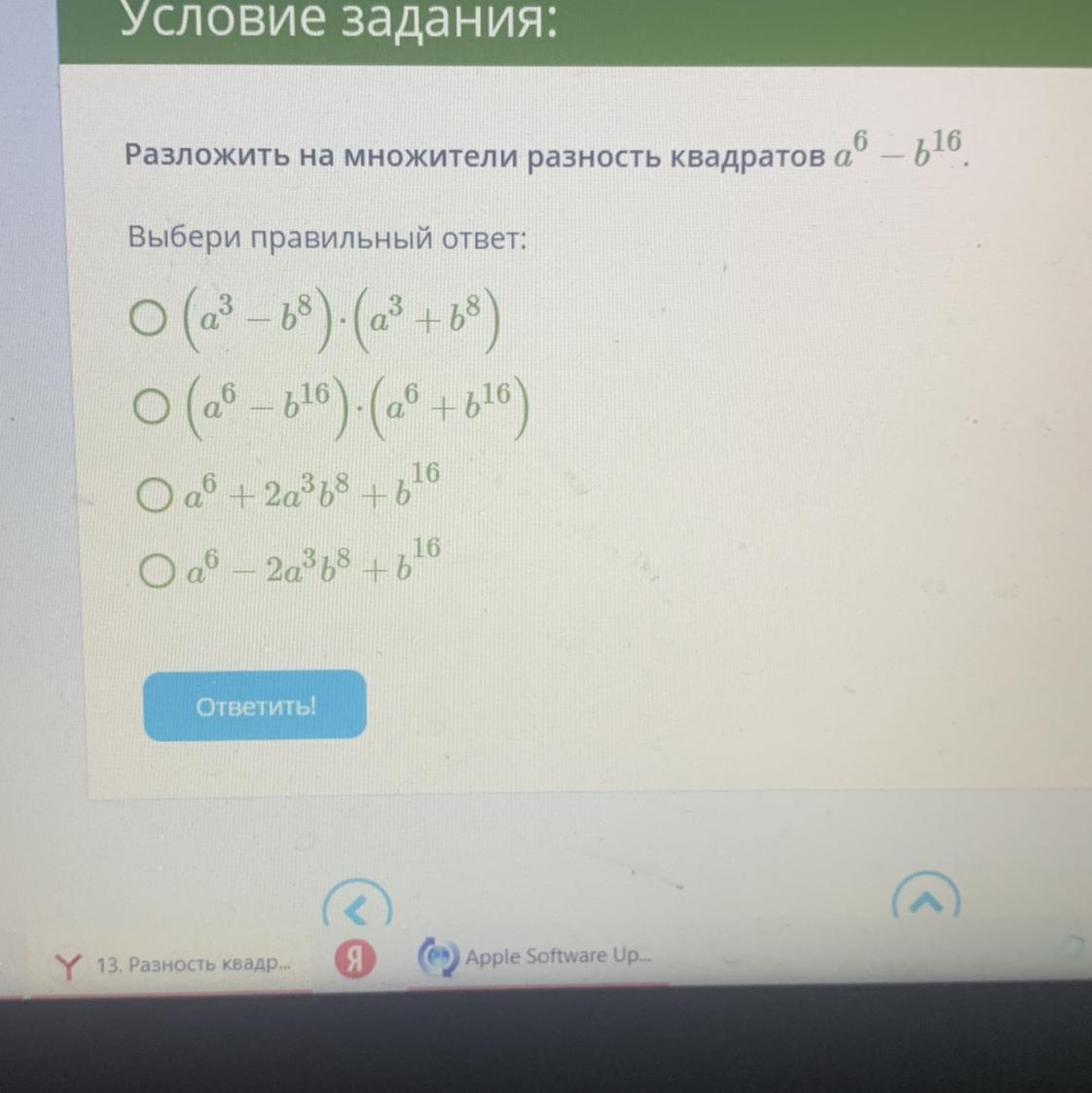 (а сверху 6 - b сверху 16) • (а сверху 6 + b сверху 16)