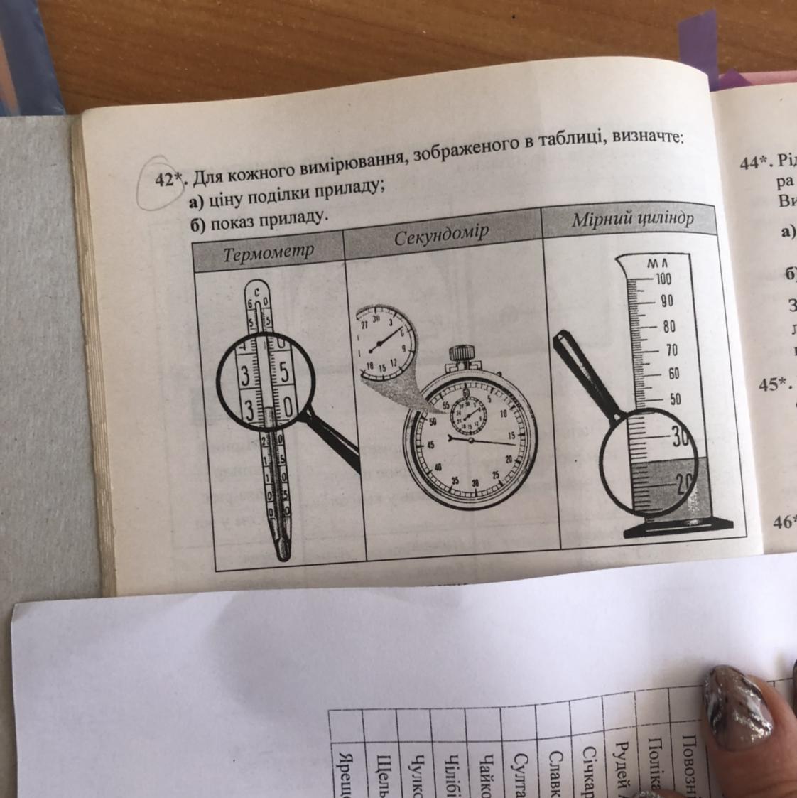 Секундомер: Ц.д.= (6-3):3=1 минута, показывает: t=5 минут. Мерный цилиндр: Ц.д.= (30-20):10=1 мл, показывает: V=25 мл, в термометре что-то там не понятно