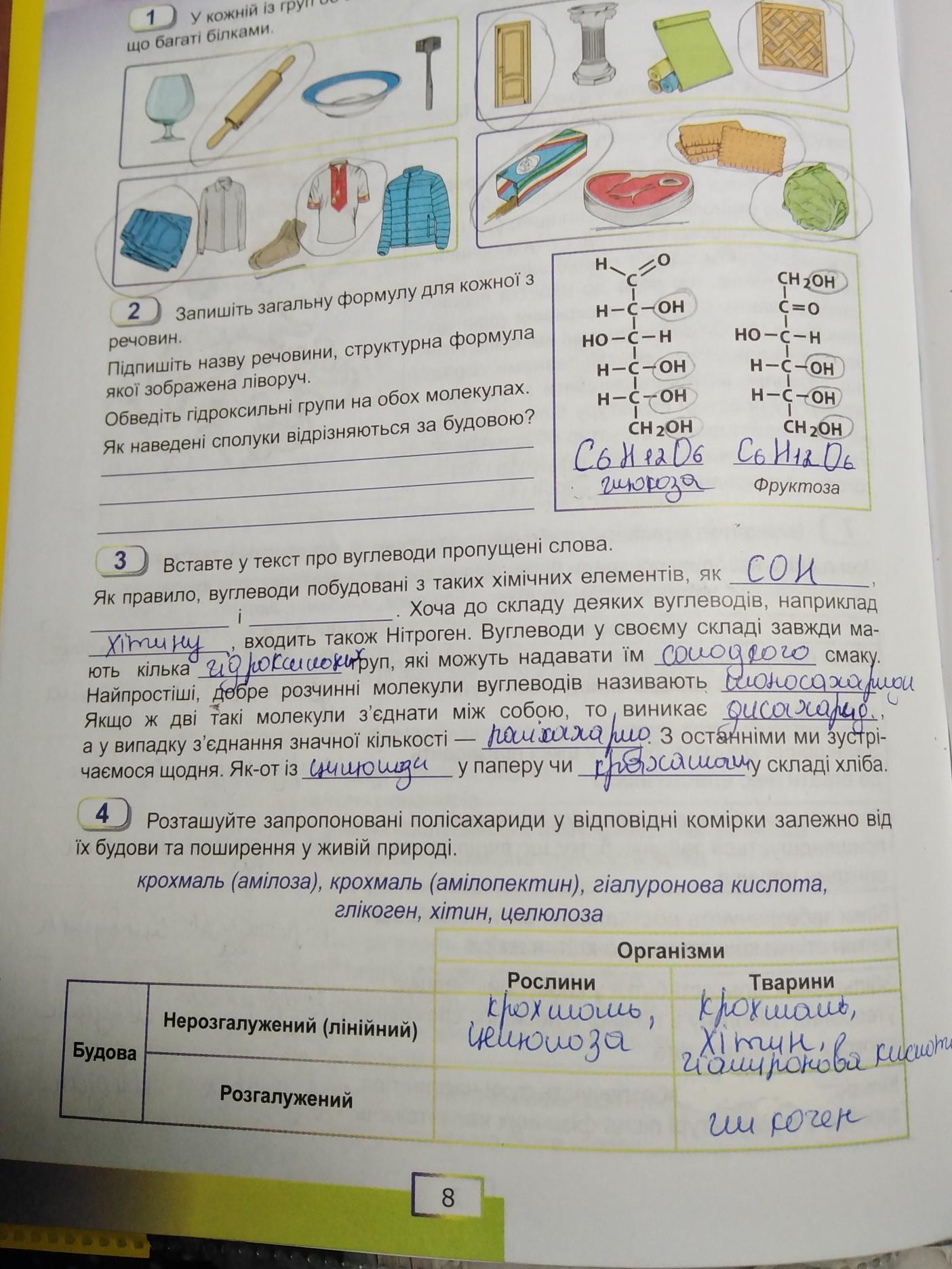 4. Розташуйте запропоновані полісахариди у відповідні комірки залежно від їх будови та поширення у живій природі: крохмаль (амілоза), крохмаль (амілопектин), гіалурована кислота, глікоген, хітин,целюлоза